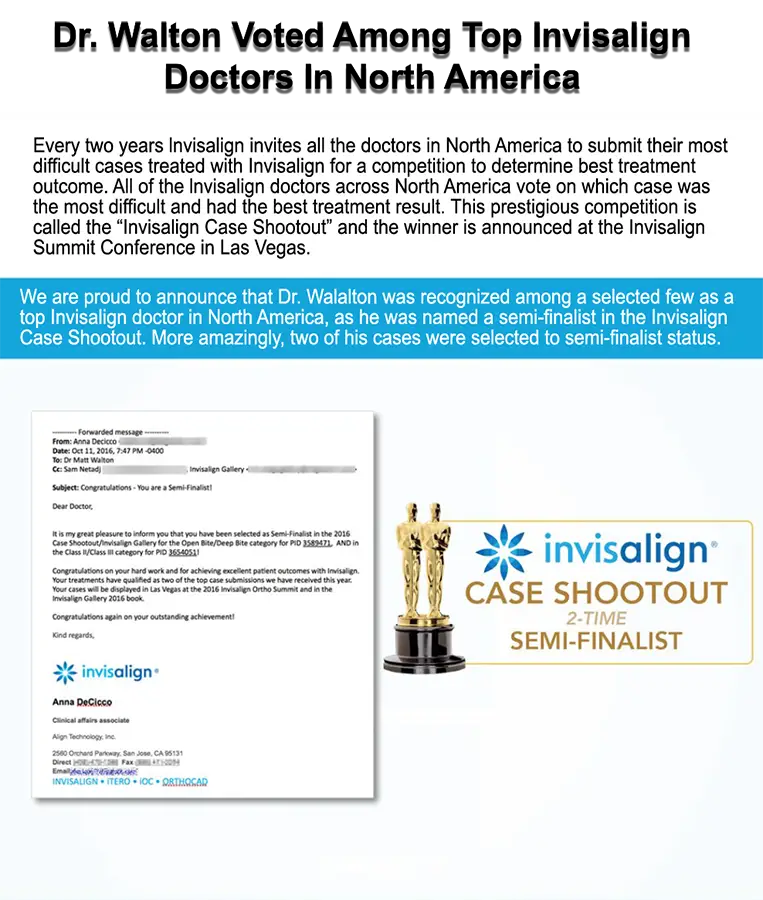 Dr. Walton’s is a one-doctor, one-location practice for Invisalign near Cumming, GA. Our focus on superior service and high quality is what makes Walton Orthodontics more a concierge-style practice than a large, impersonal Invisalign “factory.” Dr. Walton illustrates his proficiency by posting his most challenging and complex Invisalign cases for patients to review before starting treatment. As a Preferred Provider who treats between 40-60 Invisalign cases per year, he is always happy to share the stories and photographs of his very satisfied patients – just ask!